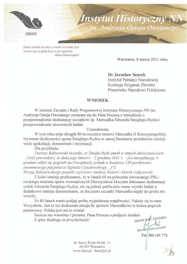W związku z przypadającą w tym roku 80. rocznicą śmierci Edwarda Śmigłego-Rydza oraz brakiem pewności co do rzeczywistego miejsca jego wiecznego spoczynku Szef UdSKiOR poparł petycję Instytutu Historycznego nn im. Andrzeja Ostoja Owsianego o przeprowadzenie ekshumacji doczesnych szczątków Marszałka, mającej na celu wyjaśnienie okoliczności jego śmierci oraz przywrócenie mu należnej czci. Wniosek został skierowany do Instytutu Pamięci Narodowej.