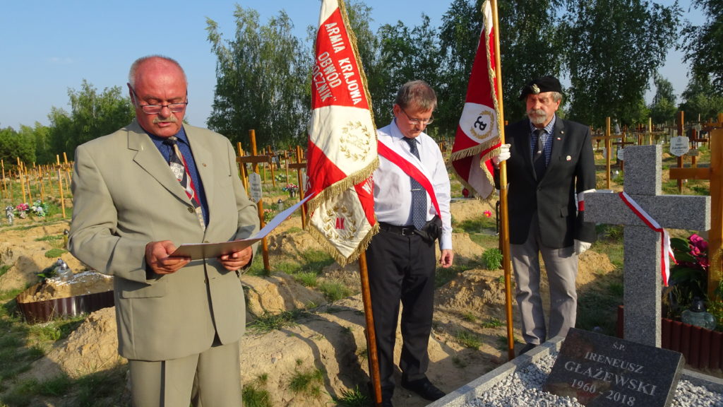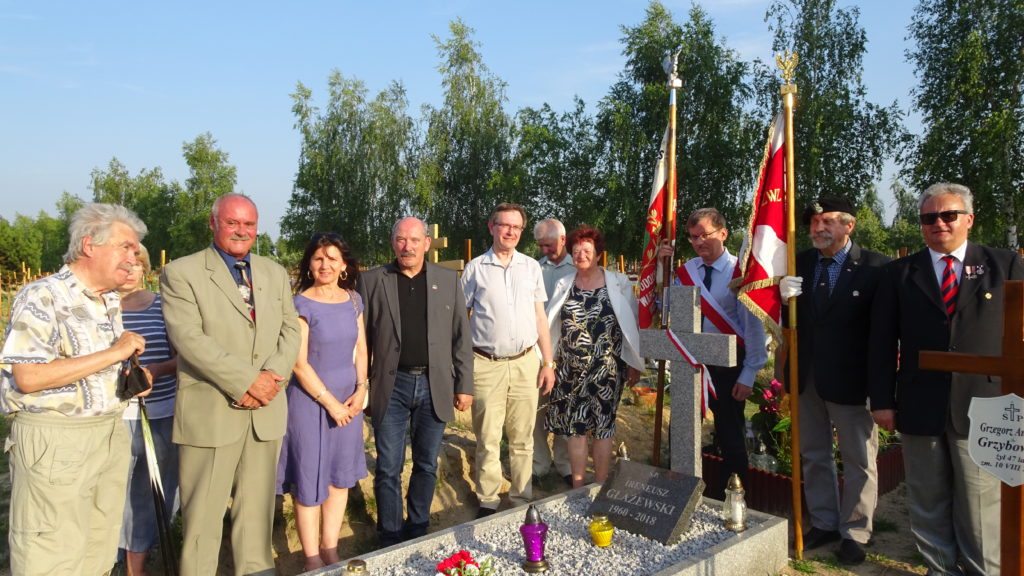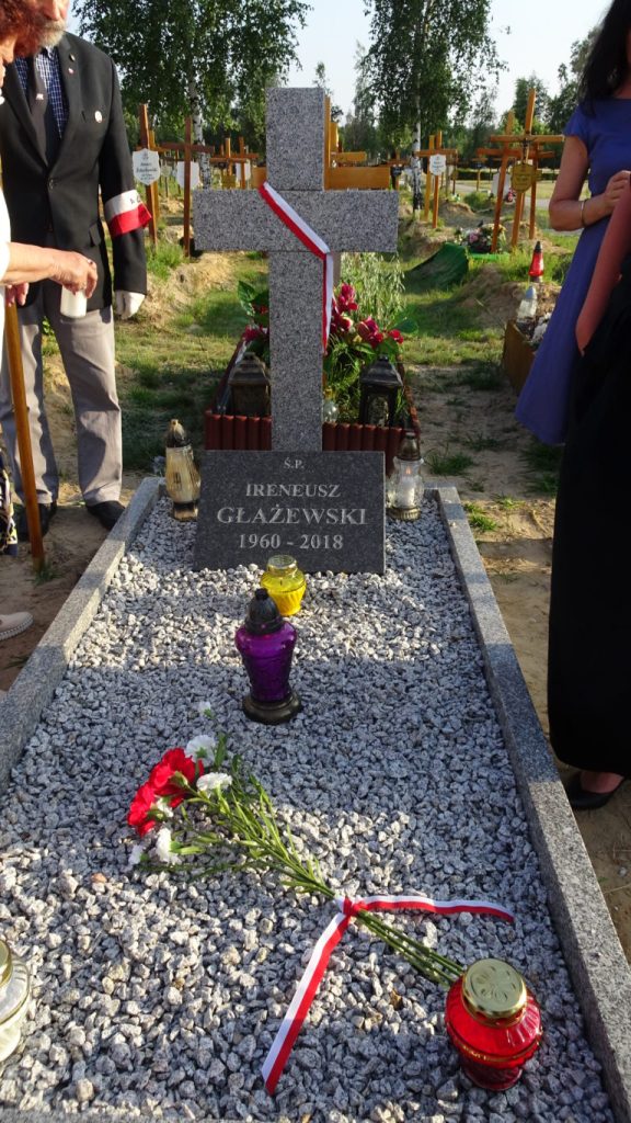 26 czerwca 2019 roku w pierwszą rocznicę śmierci IRENEUSZA GŁAŻEWSKIEGO grupa znajomych i przyjaciół spotkała się przy Jego grobie. Irek odszedł niespodziewanie i zdecydowanie przedwcześnie. Miał zaledwie 58 lat. Został zapamiętany jako zdeklarowany antykomunista, który swoim działaniem wielokrotnie udowodnił jak bliska jest Mu niepodległa Polska. Polska bez sowieckich wojsk, Polska z wolnymi wyborami, Polska silna i suwerenna. Irek przez wiele lat był aktywnym członkiem Konfederacji Polski Niepodległej, uczestniczył w wielu kampaniach wyborczych: prezydenckich, parlamentarnych i samorządowych. Był radnym, sędzią sportowym i społecznikiem. Należał do Światowego Związku Żołnierzy Armii Krajowej. Wiele osób lubiło z nim dyskutować, gdyż nie należał do tych „bijących pianę”. Potrafił bronić swojego zdania przedstawiając konkretne argumenty, nigdy nikogo nie obrażał i nie dąsał się na osoby mające odmienne opinie.